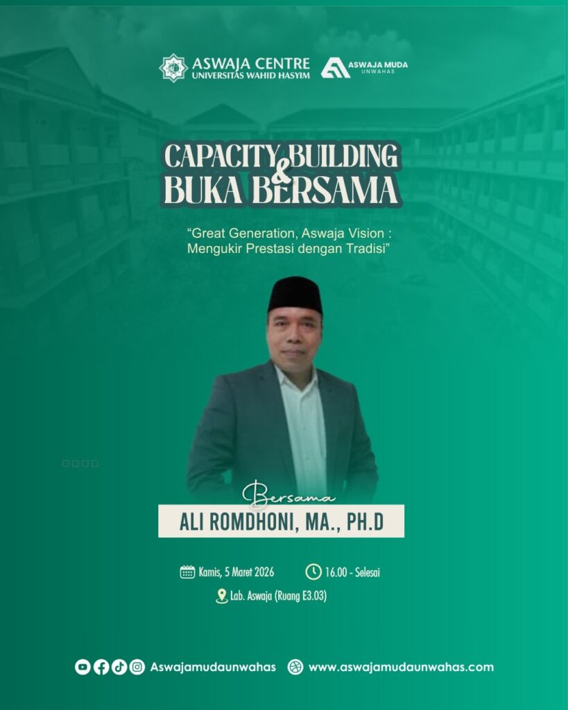 Semarang, Pusat Aswaja Universitas Wahid Hasyim menyelenggarakan kegiatan Capacity Building dan Buka Bersama bagi Pegiat Aswaja Muda Unwahas yang berlangsung di Laboratorium Aswaja Gedung E3.03 Kampus 1 Universitas Wahid Hasyim Semarang dengan Tema “Great Generation, Aswaja Vision: Excellence Rooted in Tradition”. Kegiatan ini dilaksanakan secara hybrid pada Kamis, 5 Maret 2026..